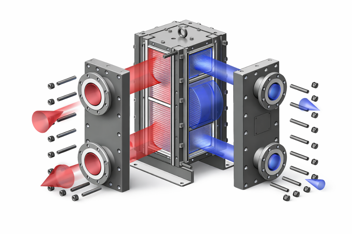 For aggressive media and refrigerants. Combines welded durability with gasketed accessibility — common in ammonia and CO₂ refrigeration systems.
