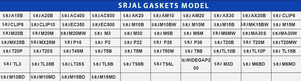 SRJ supports a wide range of SRJAL plate heat exchanger models used across industrial, process, and HVAC applications. In addition to standard replacement plates and gaskets, custom manufacturing is available based on samples or technical details for specific operating requirements, including specialized or older SRJAL configurations.